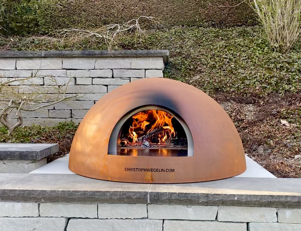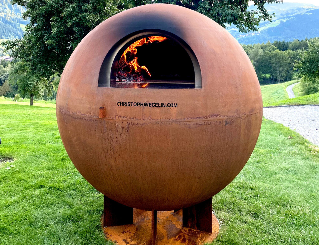Dieser Designer-Ofen zaubert innerhalb von 2 bis 3 Minuten leckere Pizzas und Flammkuchen. Auch langes Backen ist dank viel Wärmespeicher möglich. Der Ofen ist sehr sparsam im Holzverbrauch und anspruchslos im Unterhalt. In der wunderschönen Stahlkugel befindet sich der Lehmofen, geborgen und beschützt, jederzeit bereit befeuert zu werden, bei jedem Wetter, das ganze Jahr.